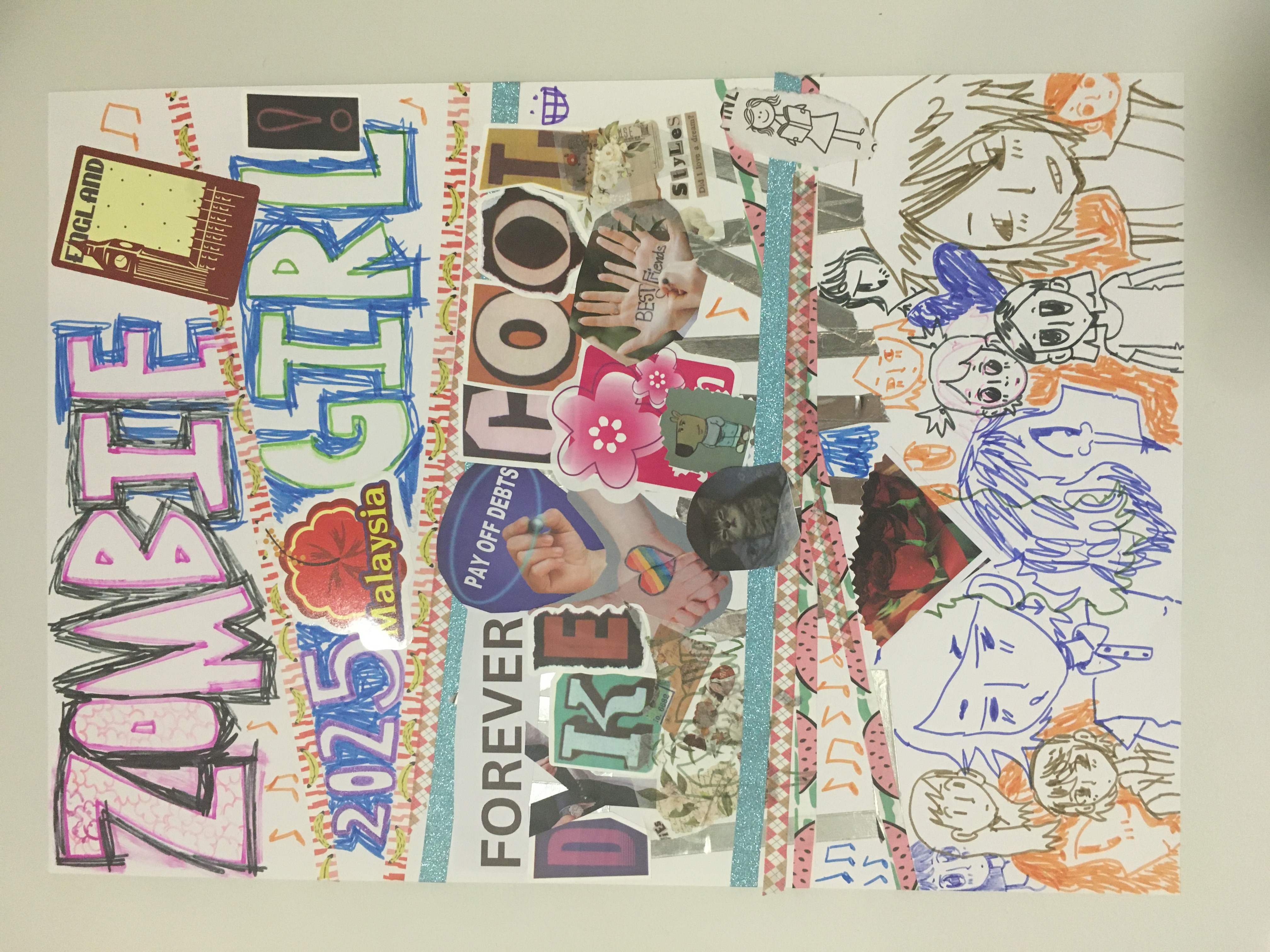 Some girl comes over to see what materials we have and she asks for our names, which is embarrasing for them because this is the first time they are learning my name. Weirdos. Anyways the girl says omg yours is so good! To me. Canada girl leans over and says wow that is really good, it's really crazy! What did you mean by that Canada *raises eyebrow* I hope noone notices I used the giant letter stickers to spell "dyke" on my poster...